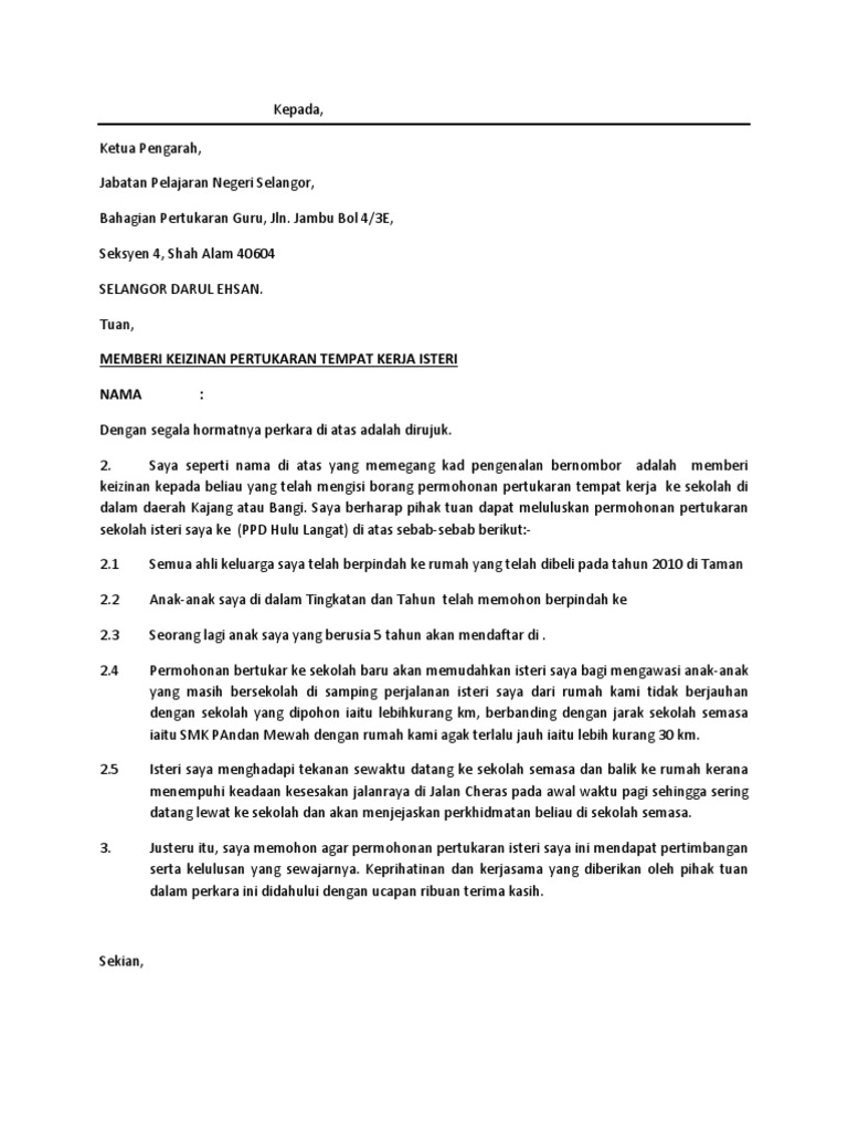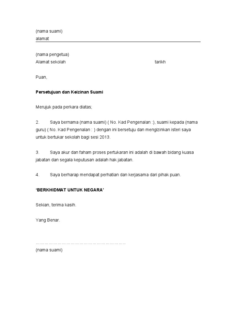 Contoh surat izin suami untuk egtukar. SekianMohd Nadib Bin Ali856-K. Untuk makluman semua guru bagi mereka yang memohon pertukaran atas alasan ikut suami surat keizinan suami seperti di bawah boleh dilampirkan semasa.